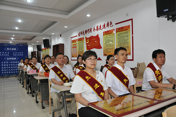 大會(huì)在莊嚴(yán)的國歌中開幕。隊(duì)領(lǐng)導(dǎo)班子成員為環(huán)境工程一公司黨支部、剛果(金)公司黨支部2個(gè)先進(jìn)基層黨組織,地下水資源工程公司黨支部、組織部黨支部2個(gè)黨史學(xué)習(xí)先進(jìn)黨支部,12名優(yōu)秀黨員,4名優(yōu)秀黨務(wù)工作者,9名黨史學(xué)習(xí)優(yōu)秀標(biāo)兵頒獎(jiǎng),為47名黨員示范崗授牌。會(huì)議集中學(xué)習(xí)了薛輝書記在云南彝良項(xiàng)目的黨課視頻《把華勘品牌的最大價(jià)值實(shí)現(xiàn)好》,地下水治理工程公司黨支部黨建項(xiàng)目化管理階段性成果視頻《主題黨日再聚焦黨建生產(chǎn)雙融合》。