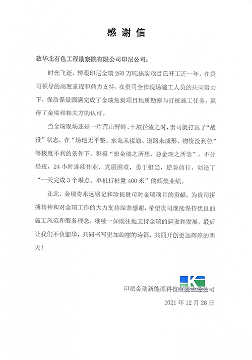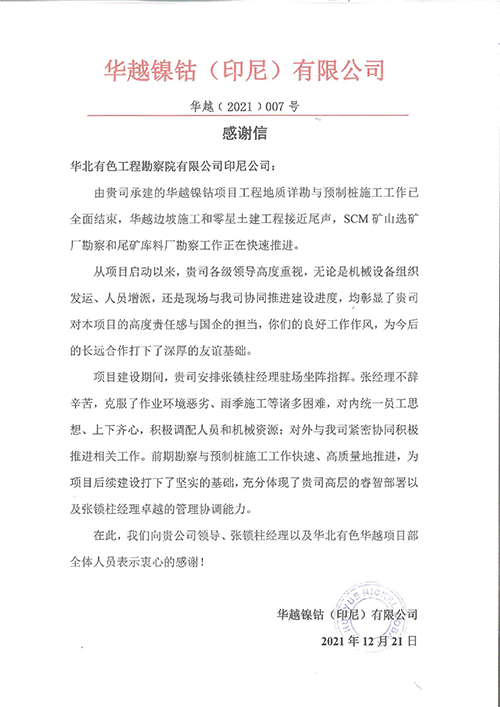 歲末年初,華越鎳鈷(印尼)有限公司、印尼金瑞新能源科技有限責(zé)任公司等陸續(xù)給華北有色工程勘察院有限公司印尼公司發(fā)來感謝信,信中對公司以高度的政治自覺和強(qiáng)烈的使命擔(dān)當(dāng),高質(zhì)量、高效能提供的技術(shù)服務(wù)以及展現(xiàn)出的華勘人的責(zé)任和擔(dān)當(dāng)予以肯定和表揚(yáng)。