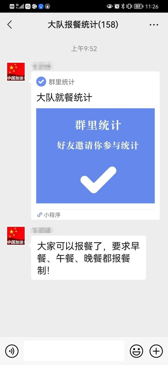 以往食堂食材量按照同一量進(jìn)行備餐,遇海外、野外人員臨時(shí)激增或銳減時(shí),無(wú)法把控食材量,特別是晚間、節(jié)假日就餐人數(shù)隨機(jī)性大,嚴(yán)重影響食材成本控制,造成浪費(fèi)?!皥?bào)餐制”應(yīng)運(yùn)而生,采用微信群的“報(bào)餐小程序”功能精準(zhǔn)統(tǒng)計(jì)就餐人數(shù),即需要用餐的職工提前一天在微信群內(nèi)點(diǎn)擊小程序進(jìn)行報(bào)餐,選擇早、午、晚就餐類別。職工只需要?jiǎng)觿?dòng)手指就可以在第二天享用到香噴噴的飯菜,真正地實(shí)現(xiàn)了程序便捷、開餐精準(zhǔn),極大地提高了辦事效率,節(jié)約了成本。