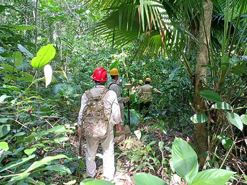 該項(xiàng)目是印尼公司今年首個(gè)探礦項(xiàng)目,大部分鉆孔位于原始森林地區(qū),勘探線路總長(zhǎng)9公里,無(wú)進(jìn)場(chǎng)道路,施工難度較大。項(xiàng)目部發(fā)揚(yáng)“逢山開(kāi)路、遇水搭橋”的奮斗精神,敢于擔(dān)當(dāng),攻堅(jiān)克難,用心用力解決森林放孔、鉆機(jī)用水、交通等難題。因施工現(xiàn)場(chǎng)地形起伏較大,山林中溝谷縱橫,樹(shù)林茂密,采用全站儀效率極低,GPS信號(hào)時(shí)有時(shí)無(wú)。項(xiàng)目部決定先讓工人用砍刀修出小道,然后攜帶GPS等測(cè)量設(shè)備進(jìn)入森林地區(qū),測(cè)放出大致孔位后安排挖機(jī)修路,最后再精確定位。印尼當(dāng)?shù)貧夂蚋邷匮谉?,森林中蚊蟲(chóng)肆虐,密不透風(fēng),手機(jī)無(wú)信號(hào),時(shí)不時(shí)還有小動(dòng)物出沒(méi),踏勘人員需要時(shí)時(shí)刻刻提高警惕,這對(duì)踏勘組人員體能及意志力是一個(gè)極大的考驗(yàn)。為了提高工作效率,項(xiàng)目人員攜帶干糧進(jìn)山,中午稍作休息補(bǔ)充能量,便繼續(xù)向森林深處進(jìn)發(fā)。每到達(dá)一個(gè)新的孔位,對(duì)于踏勘人員來(lái)說(shuō)就是一次勝利。由于現(xiàn)場(chǎng)踏勘時(shí)沒(méi)有在森林中找到水源。通過(guò)跟業(yè)主協(xié)商,從最近的供水管道引水,鉆孔間直線距離大于200米,單線最大供水長(zhǎng)度約3.5公里。項(xiàng)目部便采用方桶裝滿水后,讓挖機(jī)一桶一桶吊進(jìn)去,或從路邊挖水坑,用抽水泵一站一站倒過(guò)去。項(xiàng)目人員上下班時(shí),皮卡車僅能將他們送到山腳下,剩下的路程只能靠他們徒步前行,他們卻從未喊過(guò)苦、叫過(guò)累。