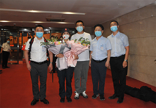 儀式結束后,在鮮花和掌聲中,隊員們入貴賓候機室,黨委書記劉喜鵬代表黨委及全隊職工獻上鮮花,并歡迎何亞靜同志回家。在經歷了四十多天的分離后,何亞靜同志終于迎來了與家人團聚的時刻,并與前來接機的家屬緊緊相擁。