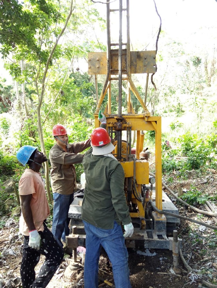 按照甲方要求 , 項目組成員于2017 年3月按時到達(dá)格林納達(dá),第一時間拜訪了中國駐格林納達(dá)大使館大使及管理該項目的當(dāng)?shù)卣畽C(jī)構(gòu),詳細(xì)了解了施工地區(qū)安全形勢及施工期間需要注意的事項。由于前期各項工作準(zhǔn)備充足,項目組人員到達(dá)場地后很快進(jìn)入了工作狀態(tài),馬上對各個場地進(jìn)行現(xiàn)場踏勘,并結(jié)合前期地形測量期間的現(xiàn)場實(shí)地考察,做好了施工流程安排。該項目共有5個場地,分散在不同的地區(qū)和島嶼上,相距較遠(yuǎn),施工設(shè)備搬運(yùn)比較困難,每次都要費(fèi)很大周折;因為該地地處熱帶,很多場地都是叢林,天氣異常悶熱,大伙要經(jīng)常頂著酷熱工作,衣服每天都會被汗水浸濕;由于施工地點(diǎn)都是在斜坡上,工作人員要保證施工安全的情況下還要時刻保持身體的平衡,給施工增加了難度。面對重重挑戰(zhàn),項目組成員團(tuán)結(jié)協(xié)力,迎難而上,克服氣候、環(huán)境惡劣、語言交流不暢等困難,最終順利完成了五塊場地的勘察工作,共完成地形圖測量0.785km,勘察孔198個,合計完成鉆探2149延米。