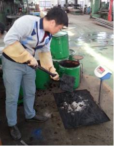 進(jìn)行試驗(yàn)首先要研制出合適的固化劑,研究組在今年4月開(kāi)始了固化劑選型試驗(yàn)。研究人員采用數(shù)十種有機(jī)、無(wú)機(jī)化學(xué)試劑按照不同組合、不同配比、在不同溫度下進(jìn)行了試驗(yàn),選取最佳試劑組合及固化工藝,經(jīng)歷過(guò)數(shù)十次失敗,在修改了多次固化機(jī)理的方向后,終于在5月27日取得突破,研配出一種具有良好固化脫水、脫粘效果的固化劑。這種固化劑能使油泥砂在24小時(shí)內(nèi)含水量由64.8%降至15.5%,固化后樣品呈酥脆狀、手捏即碎,高位發(fā)熱量3269大卡(平頂山煤4500大卡),達(dá)到燃煤熱值的70%左右,利用價(jià)值高,完全可以與燃煤攪拌均勻,摻入燃煤中進(jìn)行焚燒,用作燃煤鍋爐燃料。按照初試試驗(yàn)估算處理成本計(jì)算,這種方法能使每噸油泥砂處理成本降至500元/噸以下,不到國(guó)家收費(fèi)標(biāo)準(zhǔn)的一半,具有良好的經(jīng)濟(jì)性。