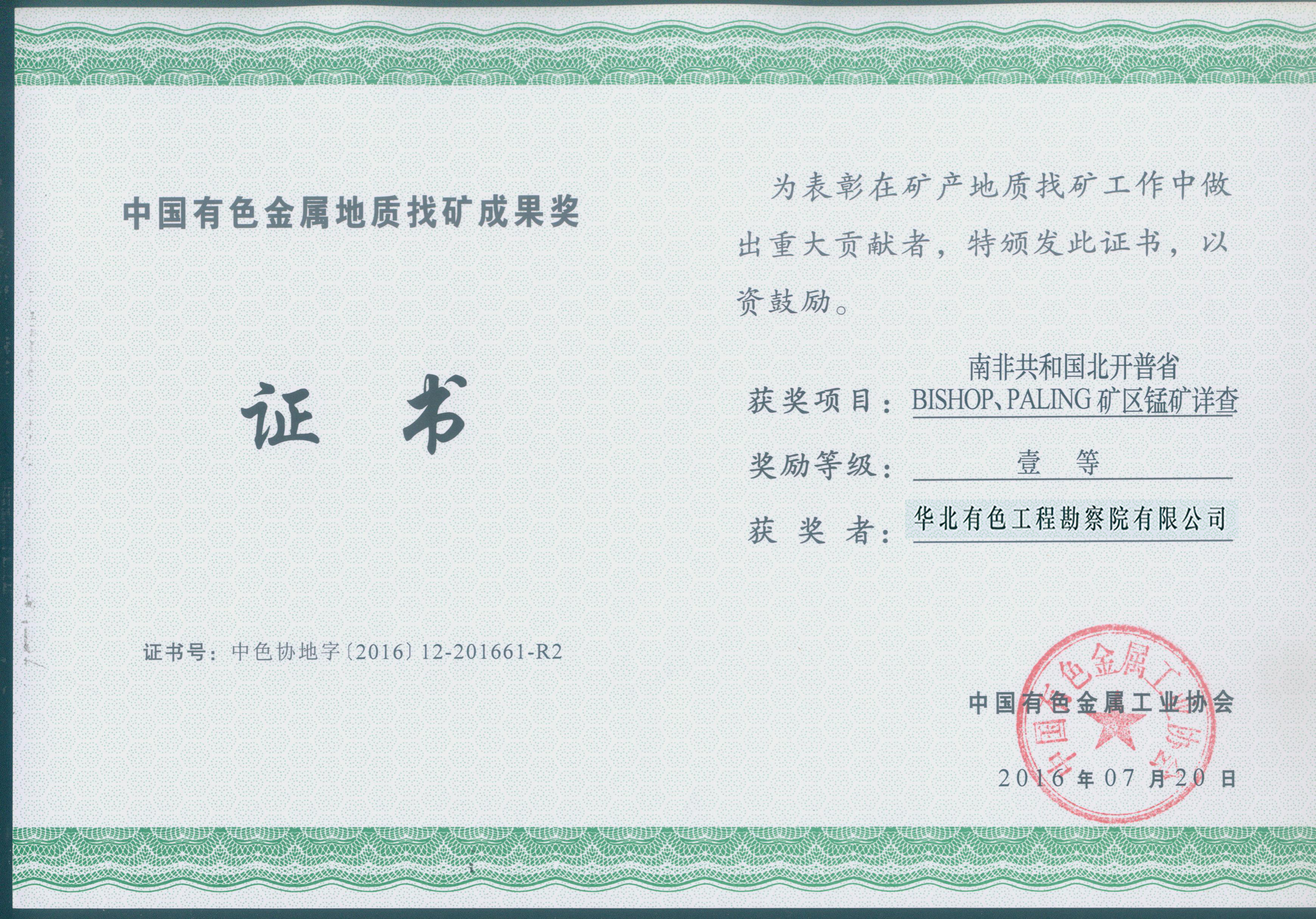 2016年5月,第五屆“中國有色金屬地質(zhì)找礦成果獎”評審會在河北燕郊組織召開。經(jīng)評委會評定,華勘院申報的“南非共和國北開普省BISHOP、PALING礦區(qū)錳礦詳查”的找礦成果榮獲“中國有色金屬地質(zhì)找礦成果獎”一等獎。