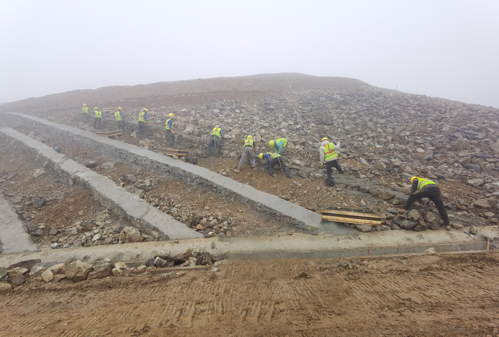 落地該項(xiàng)目后,公司立即組建一支“經(jīng)驗(yàn)豐富、作風(fēng)優(yōu)良、技術(shù)過(guò)硬”的精銳“力量”,全面統(tǒng)籌開(kāi)展工作。走進(jìn)項(xiàng)目會(huì)議室,映入眼簾的是一場(chǎng)激烈的技術(shù)研討會(huì)。項(xiàng)目負(fù)責(zé)人帶領(lǐng)團(tuán)隊(duì)正在討論牛馬塘排土場(chǎng)植被恢復(fù)施工過(guò)程中削坡減載、覆土綠化和牛馬塘采場(chǎng)掛網(wǎng)護(hù)坡時(shí)坡度陡峭、塊石多、垂直高差在300米等如何施工的技術(shù)難題,像這樣的“集中力量辦大事”的集體討論成為常態(tài),亦是這支“王牌軍隊(duì)”的特色。為解決用電用水難題,項(xiàng)目部經(jīng)常前往業(yè)主方進(jìn)行協(xié)商,期望業(yè)主盡快解決生活用水用電問(wèn)題,保證員工的正常生活。由于施工場(chǎng)地地形錯(cuò)綜復(fù)雜,道路崎嶇,施工前期為了讓機(jī)械順利進(jìn)場(chǎng),項(xiàng)目部不懼每日的風(fēng)雪交加奔波于業(yè)主方、監(jiān)理方、設(shè)計(jì)方之間,先后協(xié)調(diào)了近5家相關(guān)施工單位,保證機(jī)械盡早盡快進(jìn)場(chǎng)施工?!澳壳绊?xiàng)目部近半技術(shù)人員具有參加過(guò)院隊(duì)重點(diǎn)項(xiàng)目的工作經(jīng)驗(yàn),對(duì)項(xiàng)目順利推進(jìn)起到關(guān)鍵作用?!表?xiàng)目現(xiàn)場(chǎng)負(fù)責(zé)人齊海濤介紹說(shuō)。